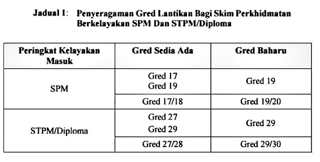 - Kakitangan berkelayakan STPM Gred 27 dimansuhkan dan diseragamkan kepada Gred 29
